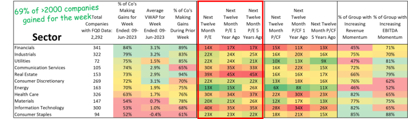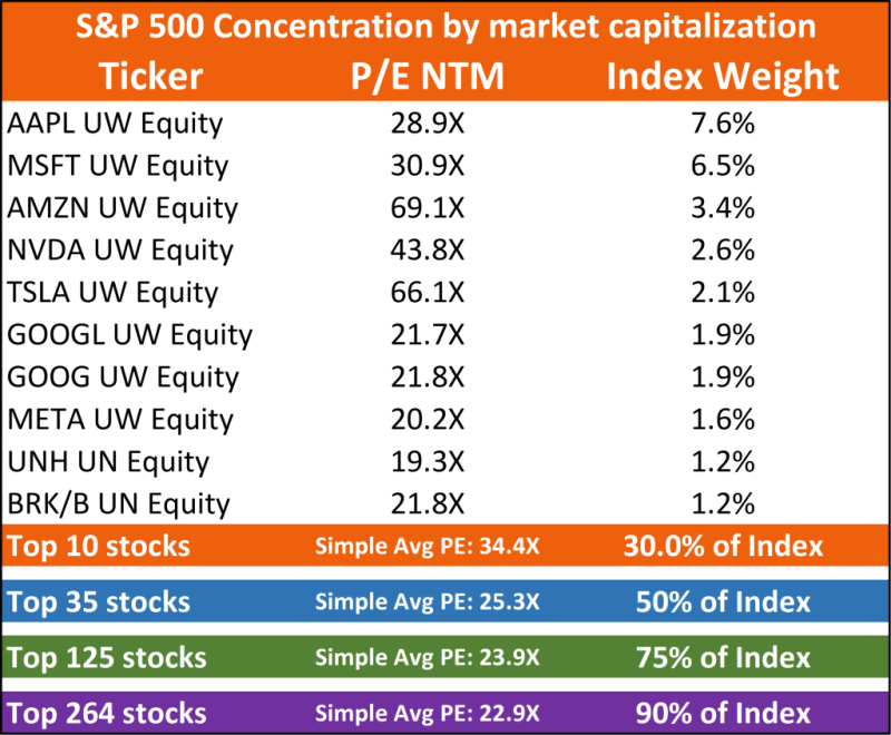 The big news of last week was that the S&P 500 has moved into what is technically bull market territory—defined as a 20% gain since its low on October 12th 2022. Unfortunately, the bulk of the index’s gains have come from a handful of heavyweight stocks that feature expensive valuations despite increased discount rates. If you look at the top 10 stocks in the S&P 500, the simple average forward P/E is 34X – that’s 50% higher than 90% of the index.